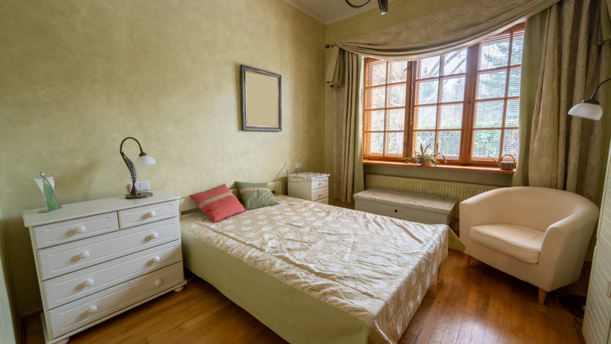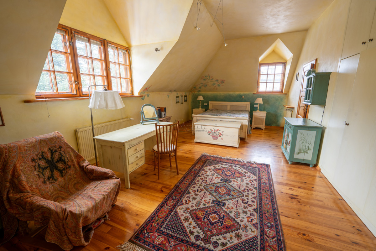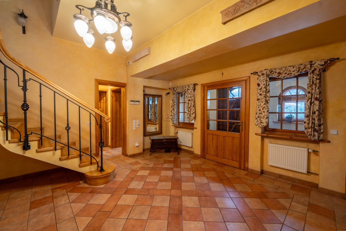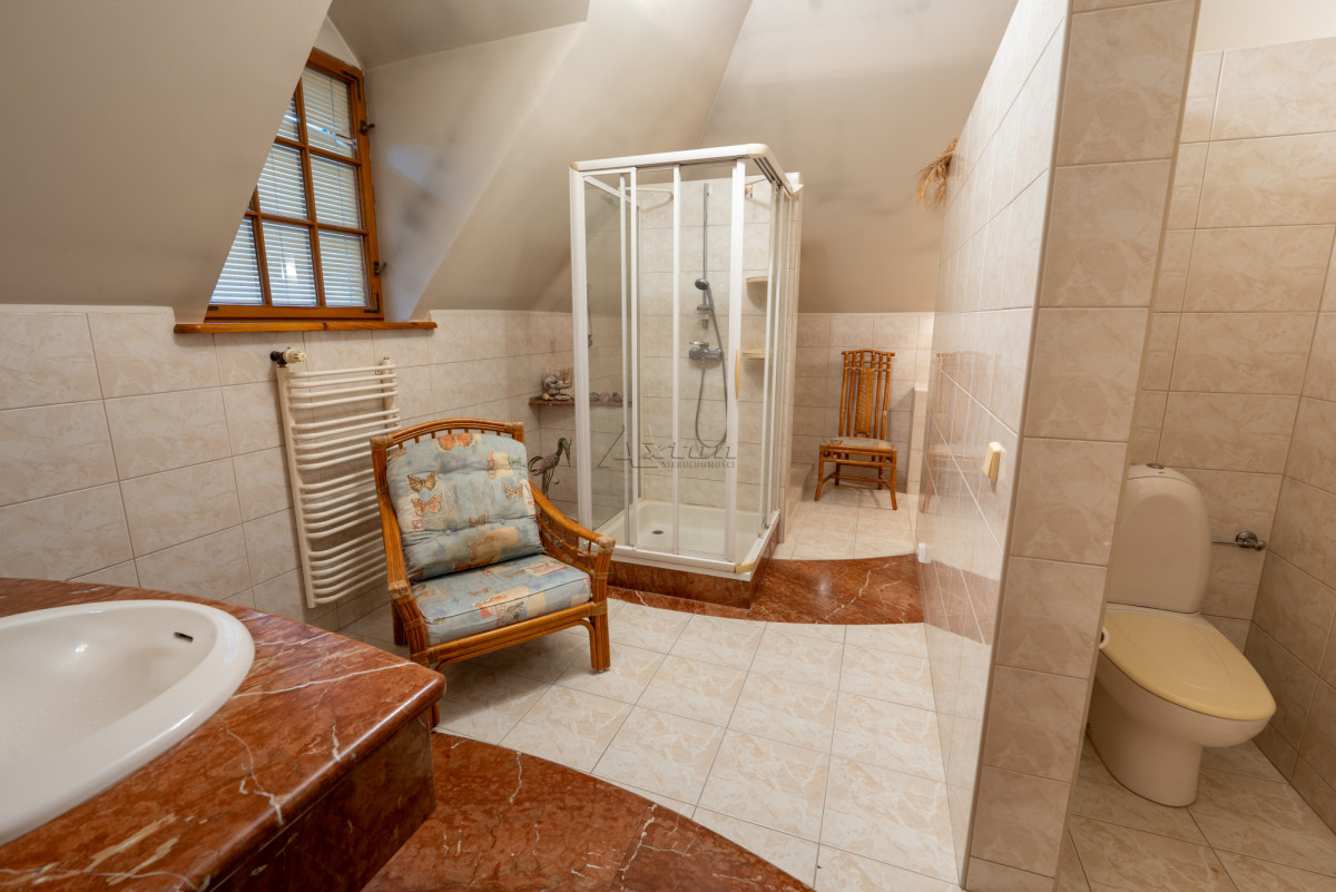 Dwukondygnacyjny dom o powierzchni użytkowej 294,94 m2 (pow. całkowita 332,77 m2), położony na pięknie zagospodarowanej działce, w okolicy domów wolno stojących, w cichym i spokojnym miejscu.