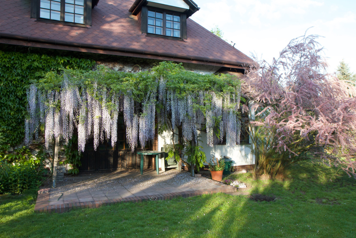Od strony południowej domu, w ogrodzie znajduje się taras pokryty piaskowcem, nad tarasem zbudowana jest drewniana pergola obrośniętą wisterią, która latem stanowi naturalną osłonę przed słońcem. Na taras wchodzi się z salonu.